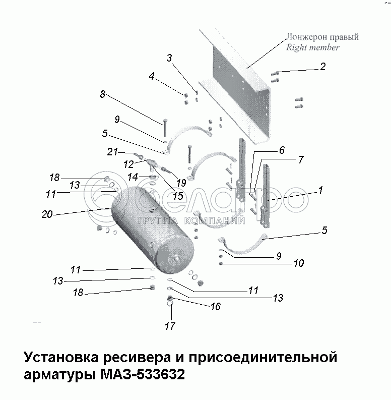 Каталог запасных частей к технике: МАЗ-533731. Установка ресивера и присоединительной арматуры МАЗ-533632