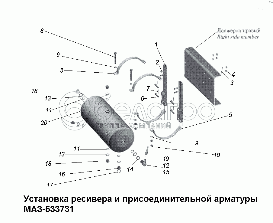 Каталог запасных частей к технике: МАЗ-533731. Установка ресивера и присоединительной арматуры МАЗ-533731