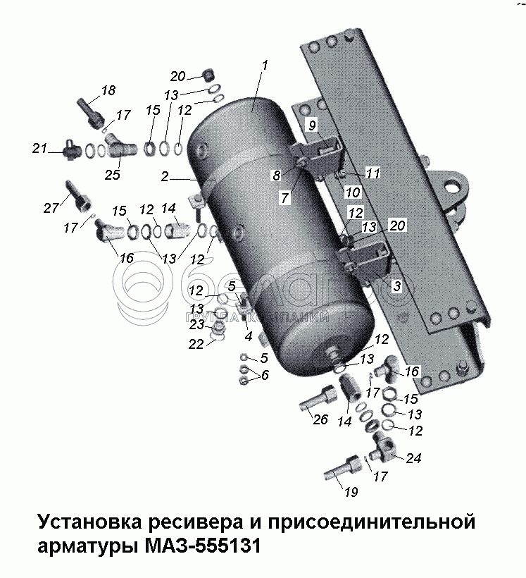 Каталог запасных частей к технике: МАЗ-533731. Установка ресивера и присоединительной арматуры МАЗ-555131