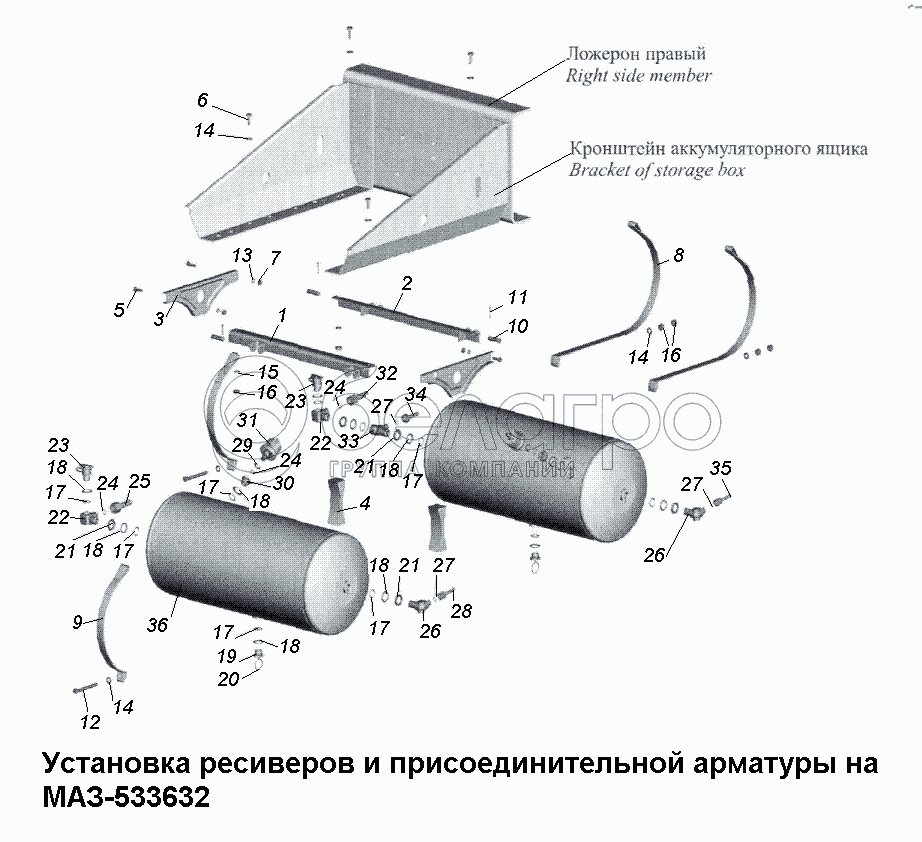 Каталог запасных частей к технике: МАЗ-533731. Установка ресиверов и присоединительной арматуры МАЗ-533632
