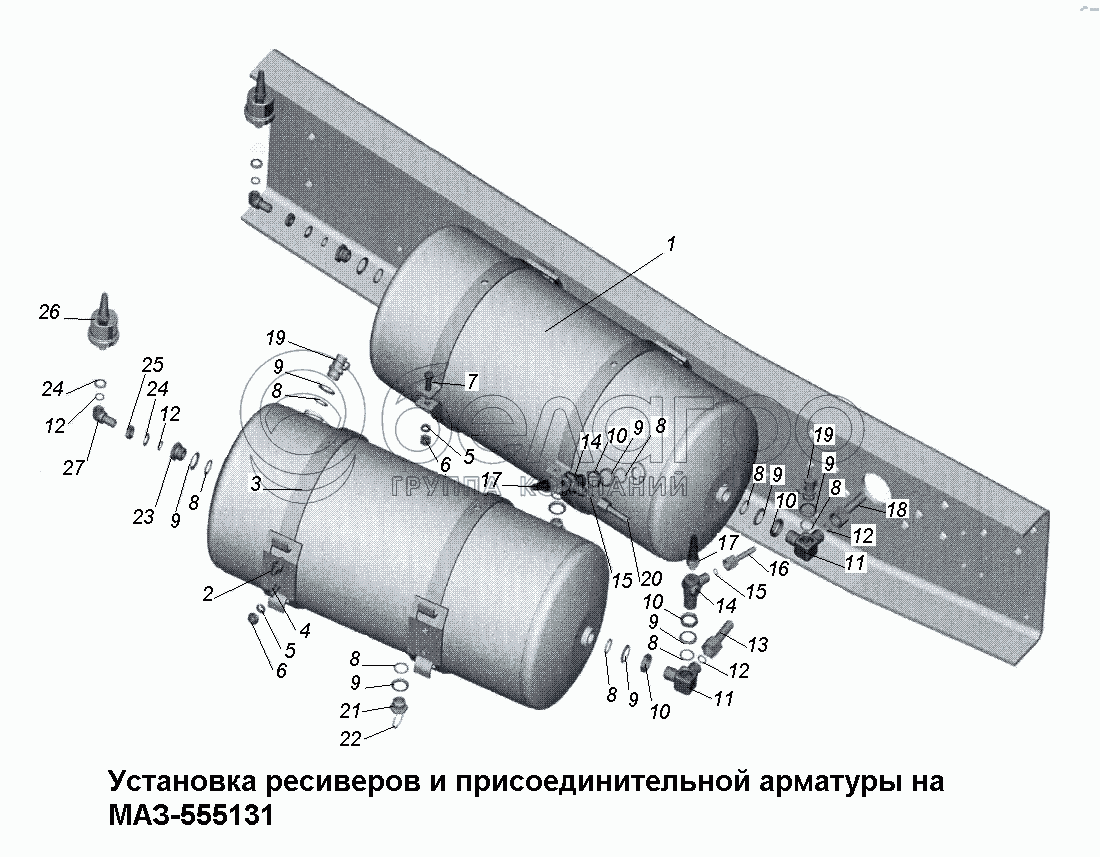 Каталог запасных частей к технике: МАЗ-533731. Установка ресиверов и присоединительной арматуры МАЗ-555131