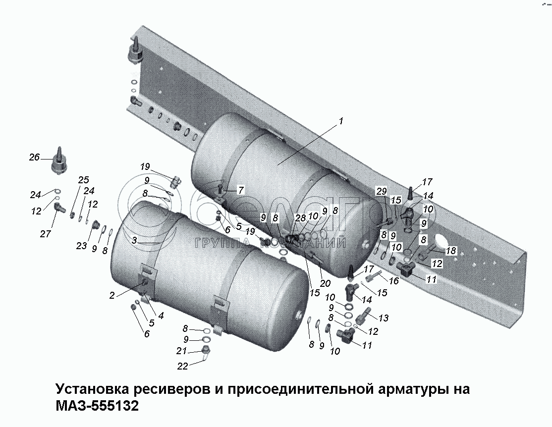 Каталог запасных частей к технике: МАЗ-533731. Установка ресиверов и присоединительной арматуры МАЗ-555132
