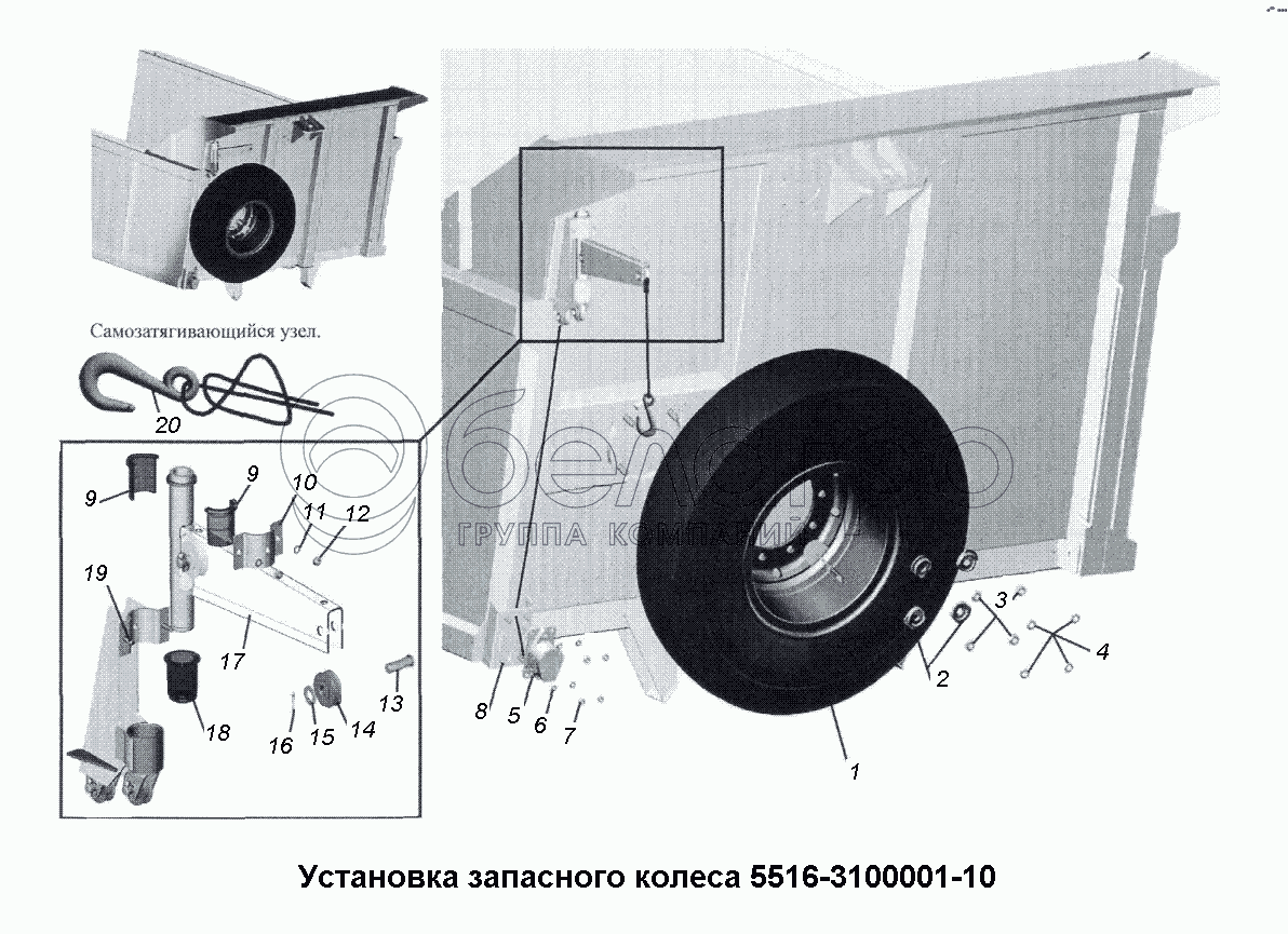 Каталог запасных частей к технике: МАЗ-533731. Установка запасного колеса 5516-3100001-10