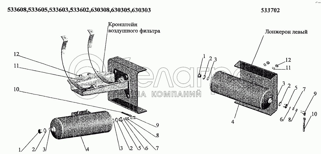 Установка ресивера и присоединительной арматуры на МАЗ-533608, МАЗ-533605, МАЗ-533603, МАЗ-533602 (лонжерон левый)
