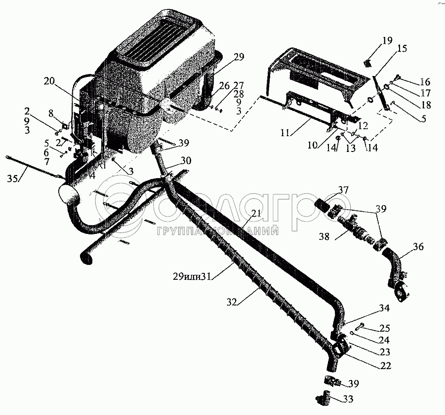 Каталог запасных частей к технике: МАЗ-5337 (2005). Установка шлангов и крана управления отопителем