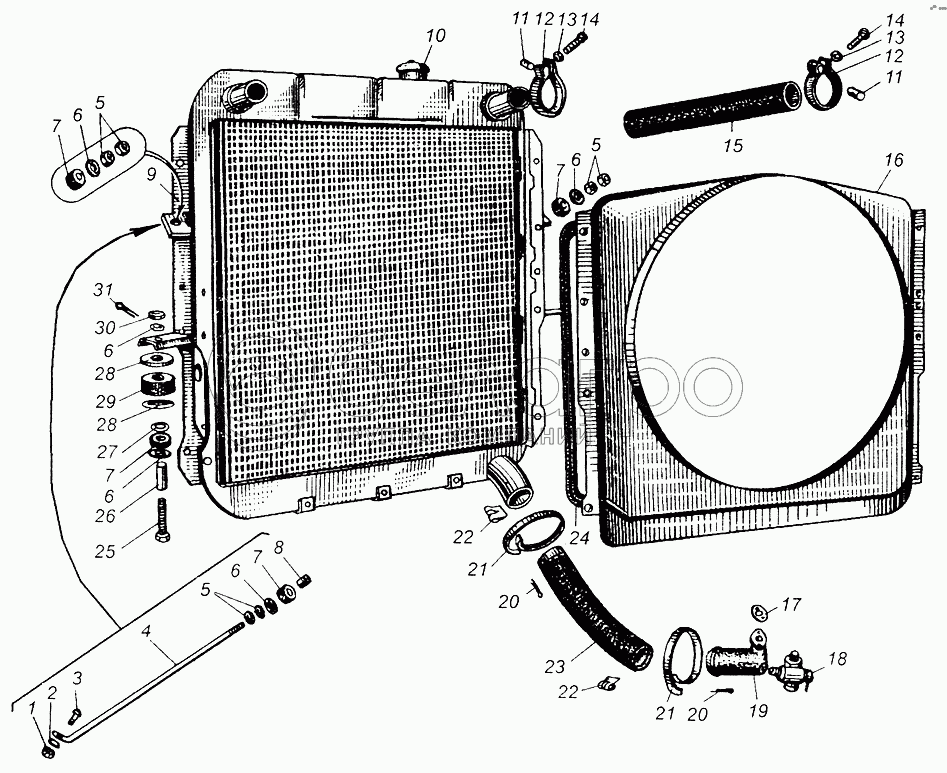 Каталог запасных частей к технике: МАЗ-5429. Радиатор и его крепление