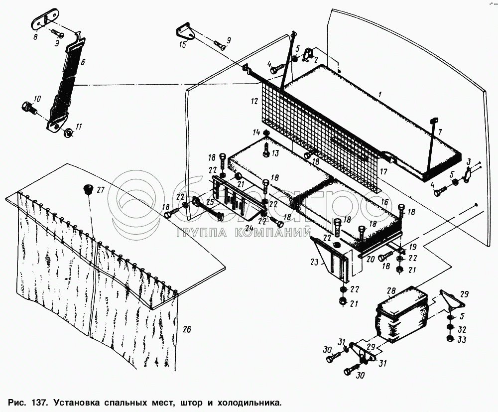 Каталог запасных частей к технике: МАЗ-54321. Установка спальных мест, штор и холодильника