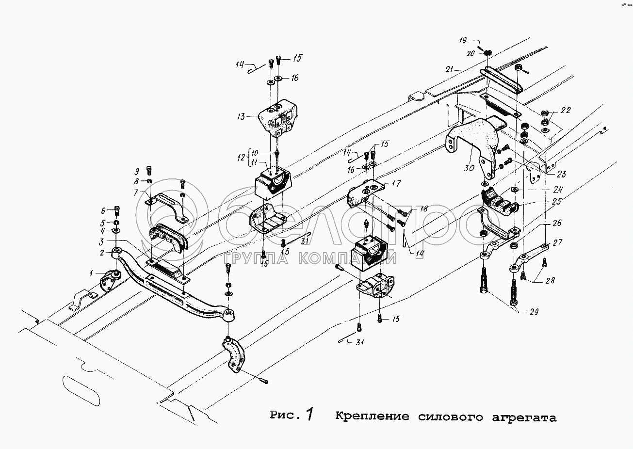 Каталог запасных частей к технике: МАЗ-54323. Крепление силового агрегата