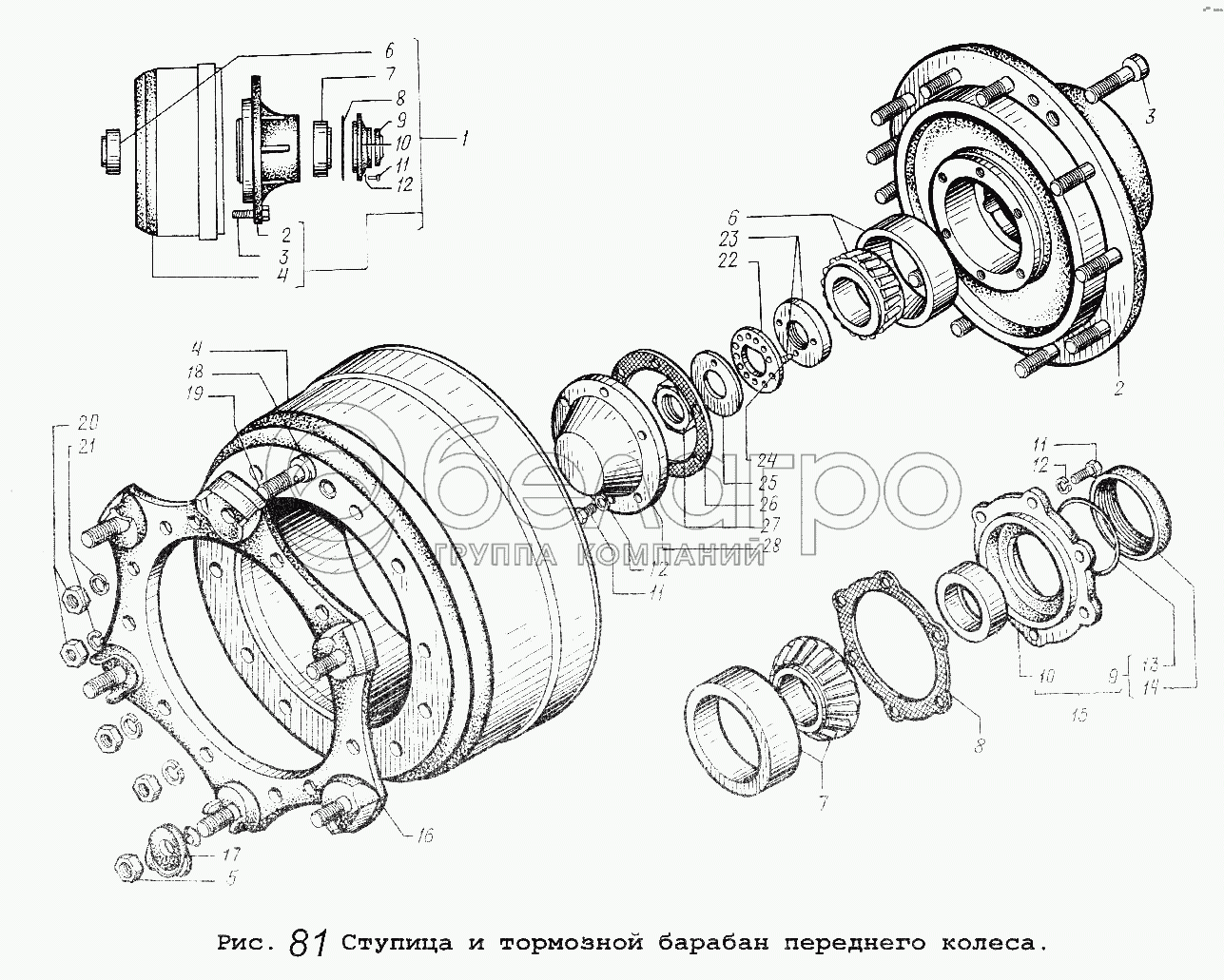 Каталог запасных частей к технике: МАЗ-54323. Ступица и тормозной барабан переднего колеса