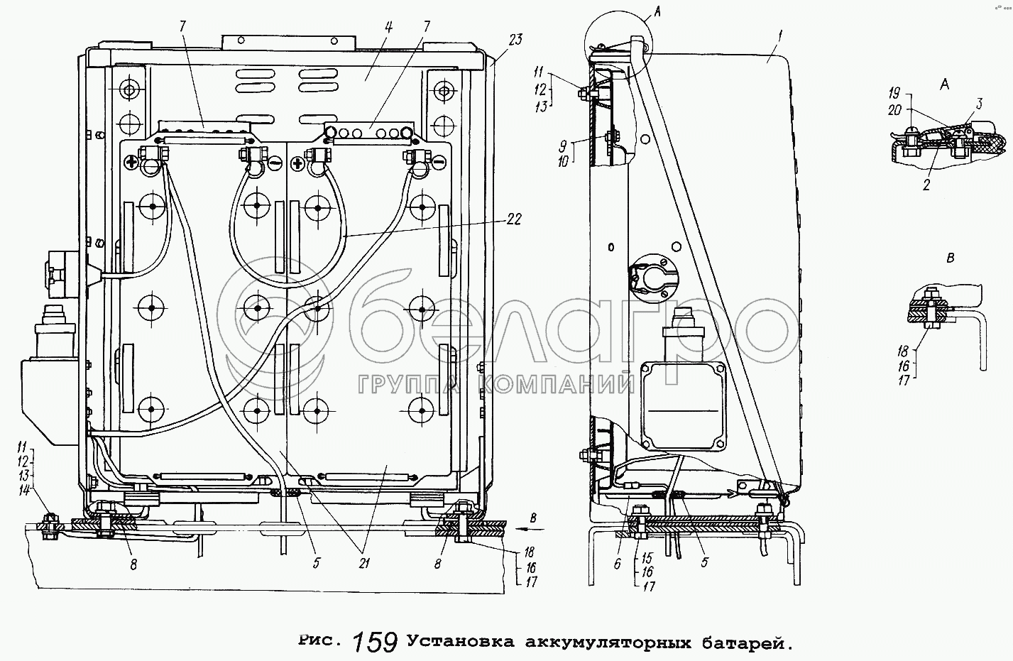 Каталог запасных частей к технике: МАЗ-54323. Установка аккумуляторных батарей