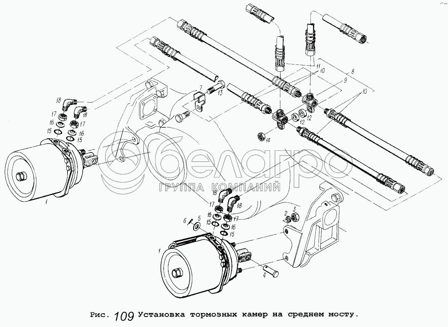 Каталог запасных частей к технике: МАЗ-54323. Установка тормозных камер на среднем мосту