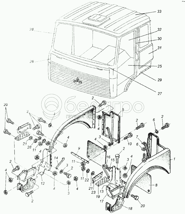 Каталог запасных частей к технике: МАЗ-54326. Кабина. Установка передних крыльев и подножек