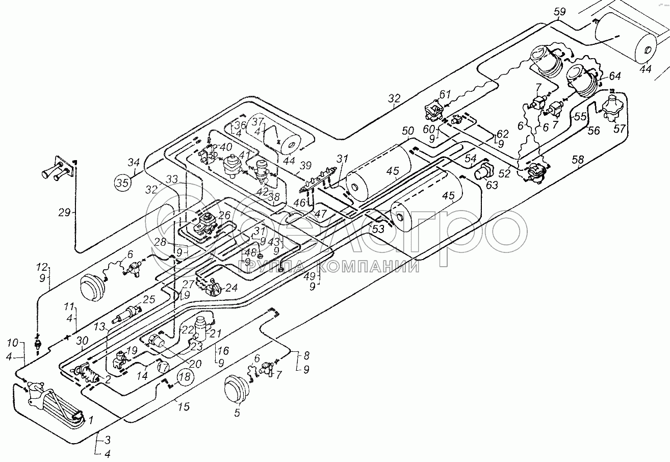 Каталог запасных частей к технике: МАЗ-54326. Схема тормозного привода автомобиля МАЗ-54326