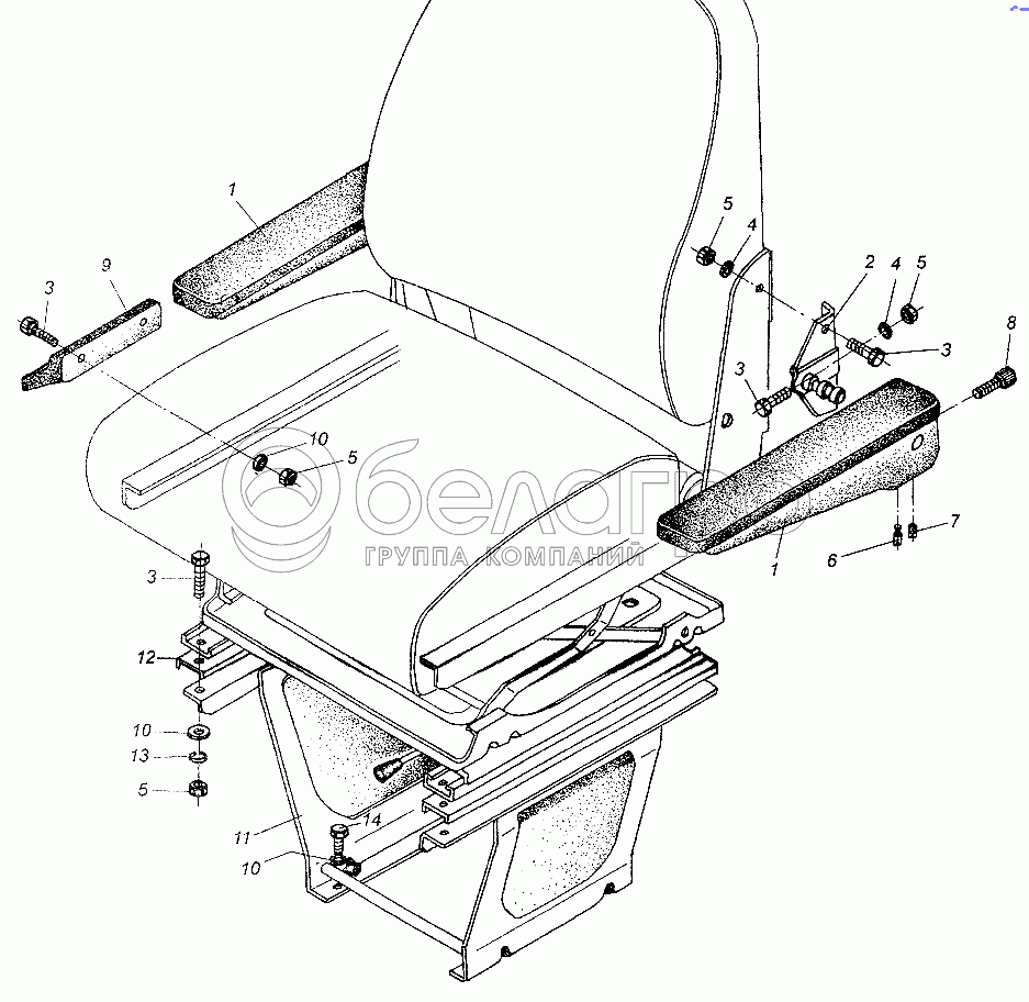 Каталог запасных частей к технике: МАЗ-54326. Установка переднего сиденья и поручней