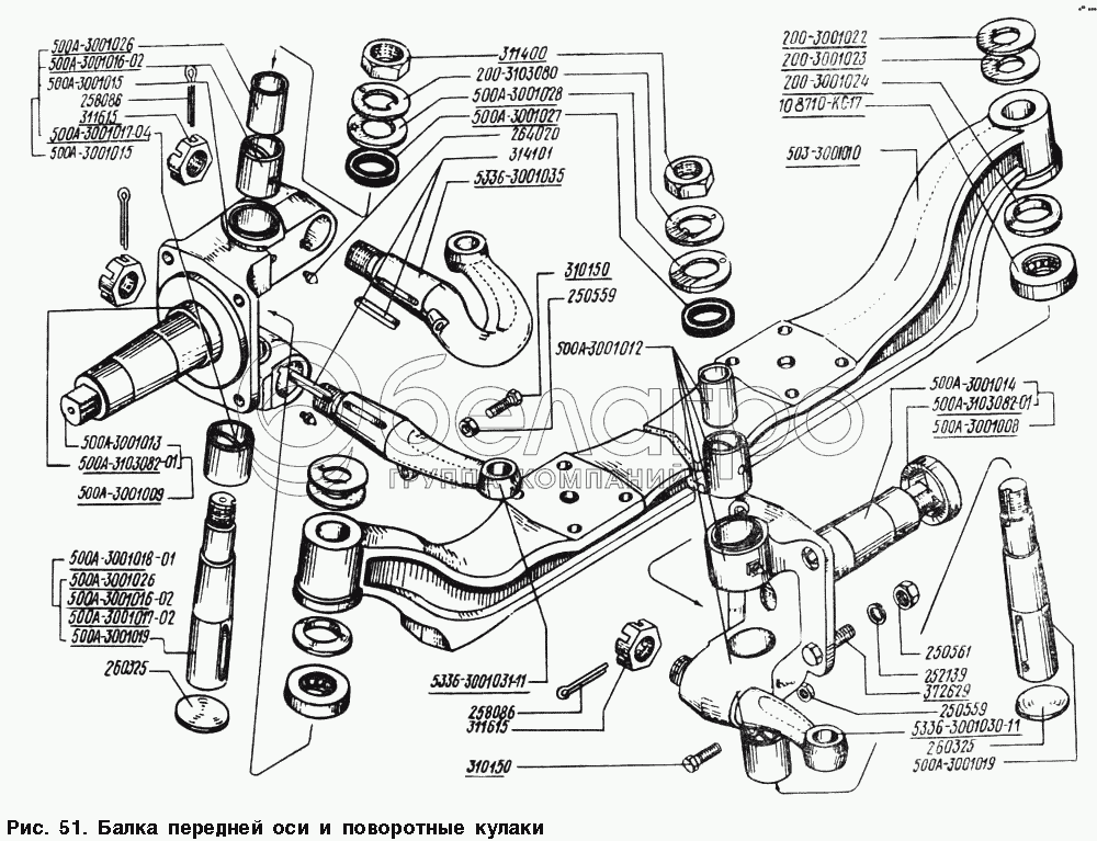 Каталог запасных частей к технике: МАЗ-54328. Балка передней оси и поворотные кулаки