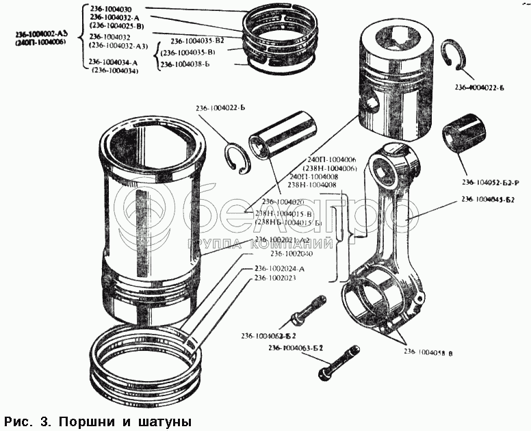 Каталог запасных частей к технике: МАЗ-54328. Поршни и шатуны