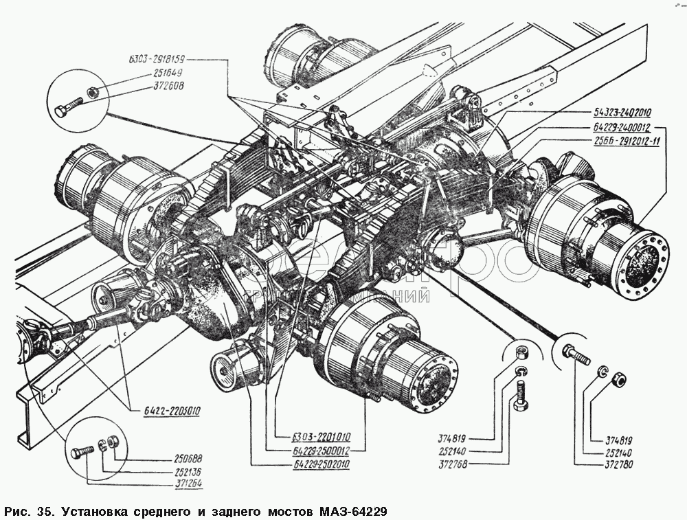 Каталог запасных частей к технике: МАЗ-54328. Установка среднего и заднего мостов МАЗ-64229