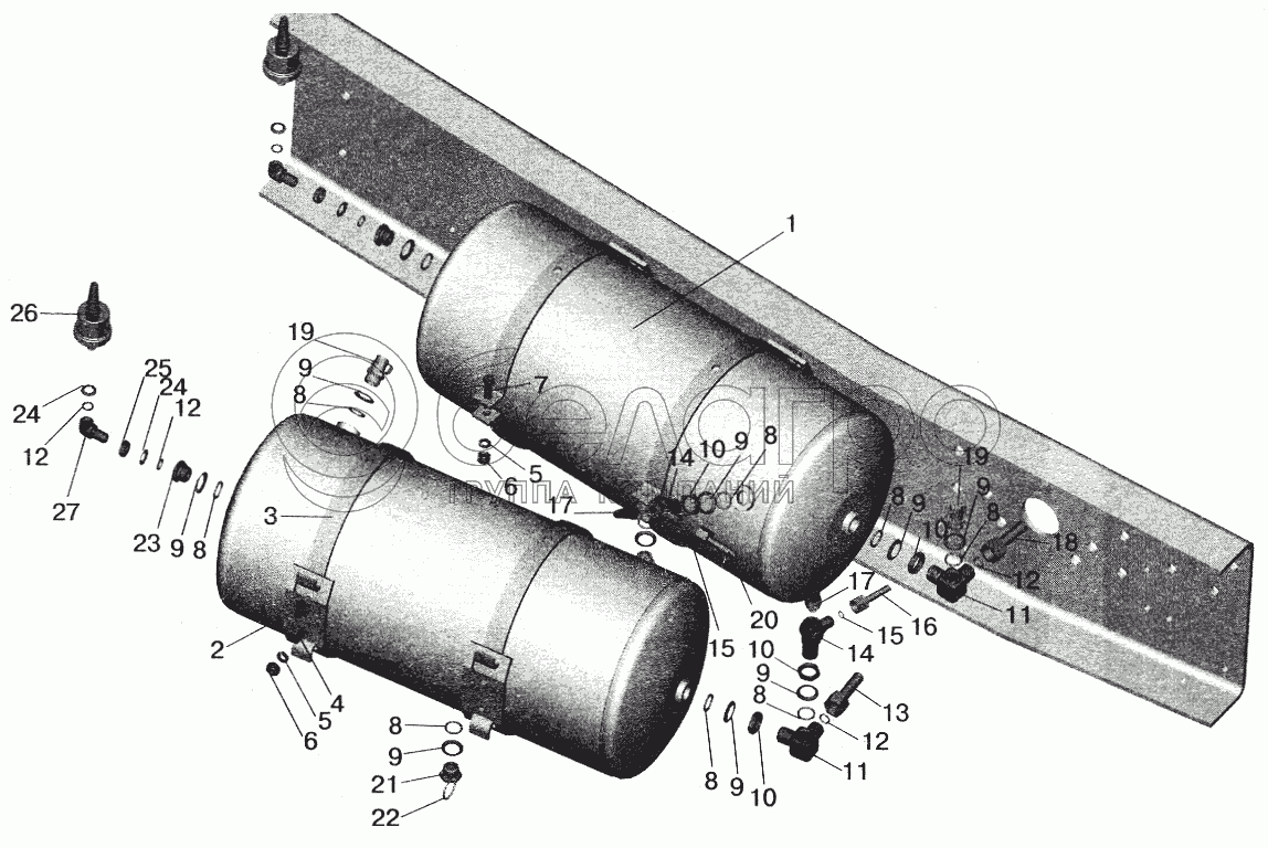 Каталог запасных частей к технике: МАЗ-5432. Установка ресиверов и присоединительной арматуры МАЗ-555102