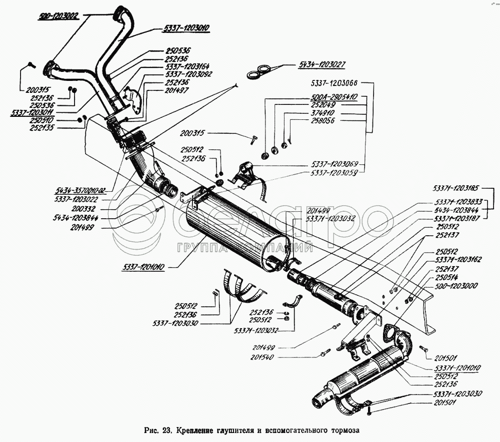 Каталог запасных частей к технике: МАЗ-5433. Крепление глушителя и вспомогательного тормоза