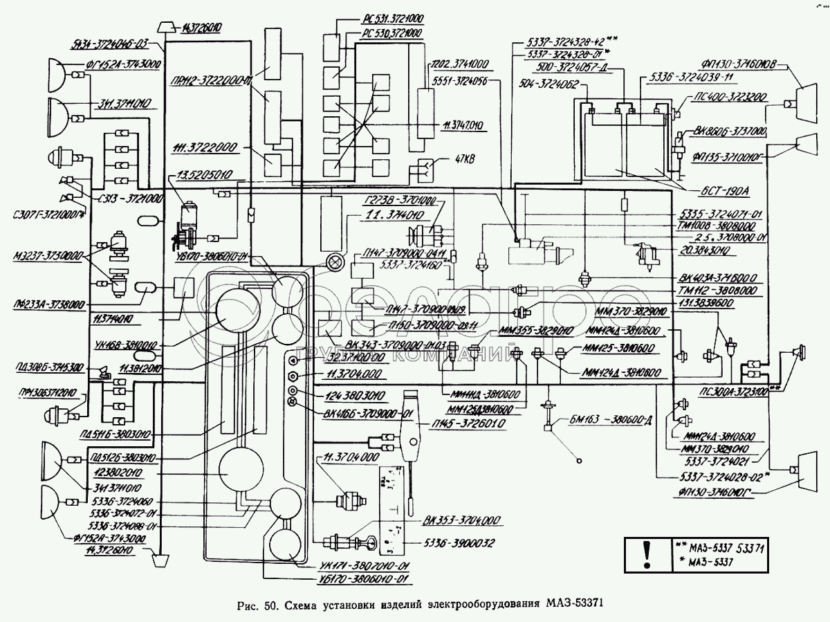 Каталог запасных частей к технике: МАЗ-5433. Схема установки изделий электрооборудования МАЗ-53371