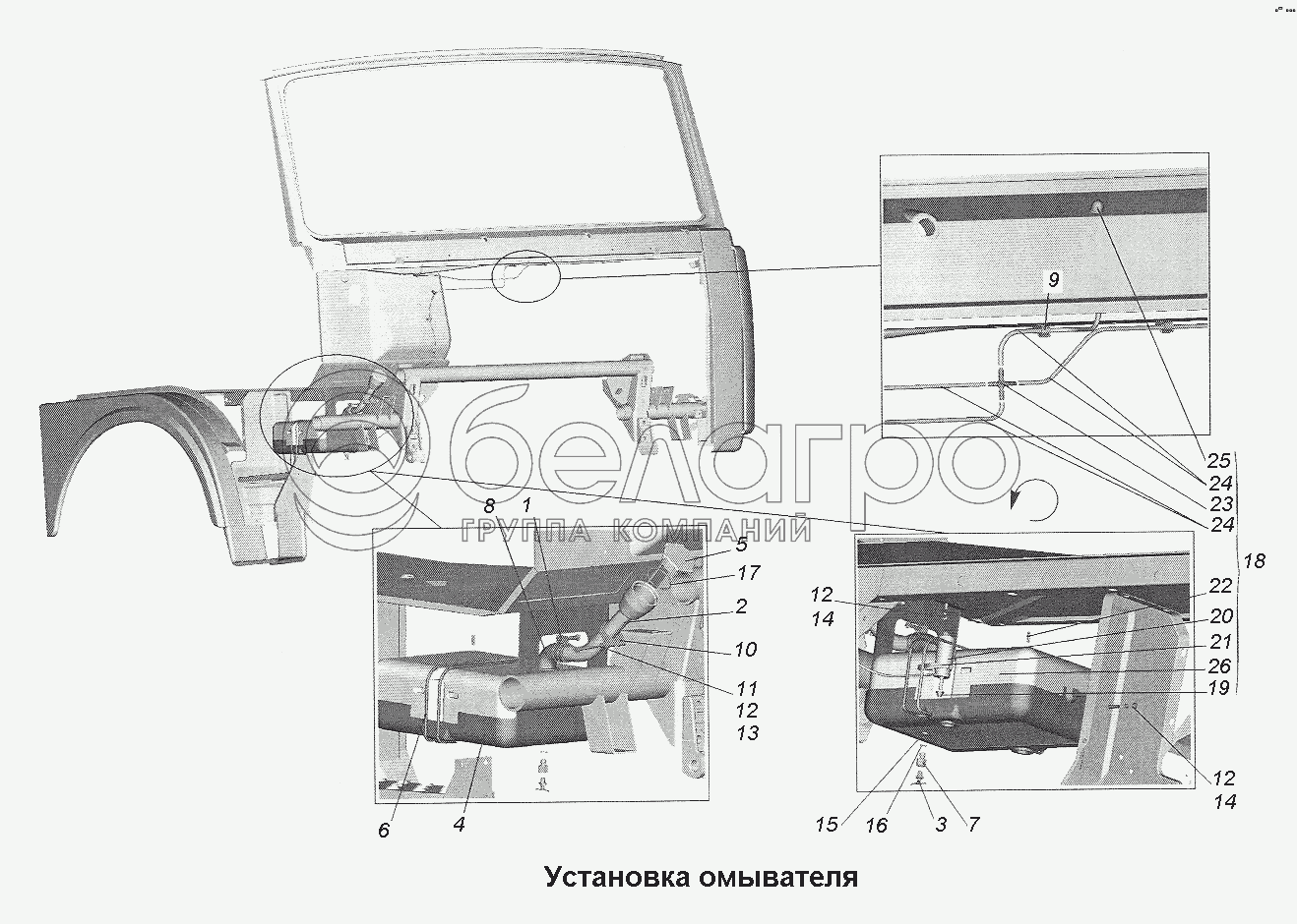 Каталог запасных частей к технике: МАЗ-543403, 641705, 641708. Установка омывателя