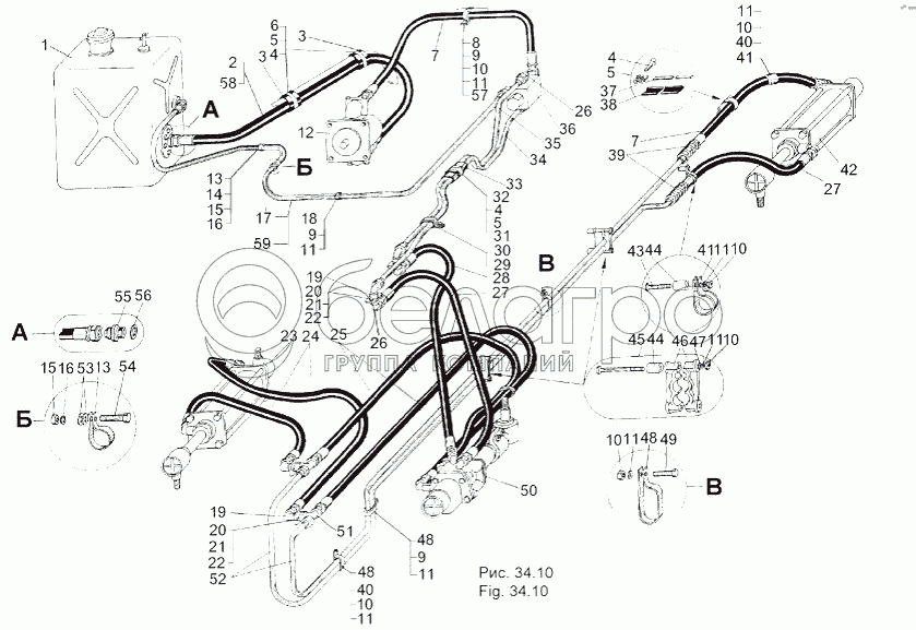 Каталог запасных частей к технике: МАЗ-543 (7310). Установка шлангов и трубопроводов усилителя руля
