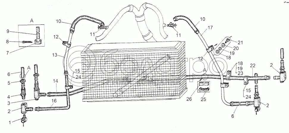 Каталог запасных частей к технике: МАЗ-543 (7310). Установка трубопроводов отопителей кабин 543, 543A