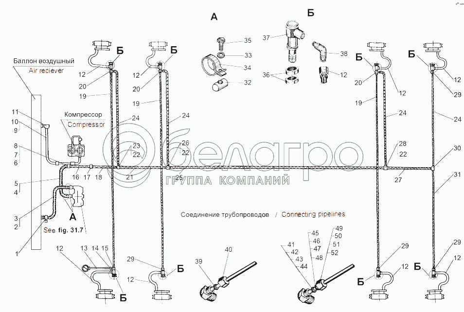 Каталог запасных частей к технике: МАЗ-543 (7310). Установка трубопроводов системы накачки шин