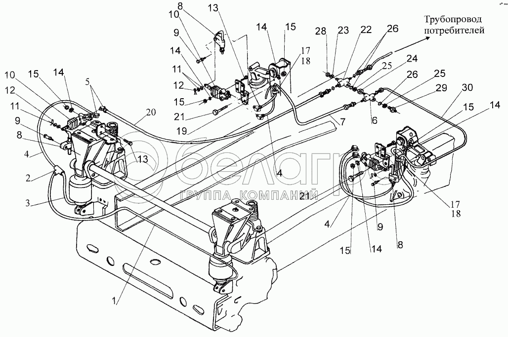 Каталог запасных частей к технике: МАЗ-544069. Установка регуляторов положения кабины с пневмогидроэлементами