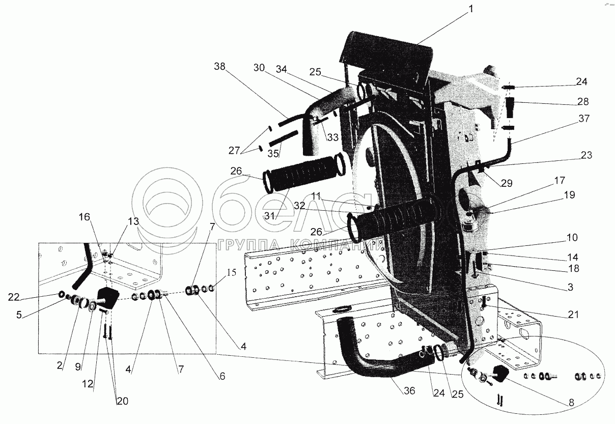 Каталог запасных частей к технике: МАЗ-544069. Установка системы охлаждения 643069-1300005