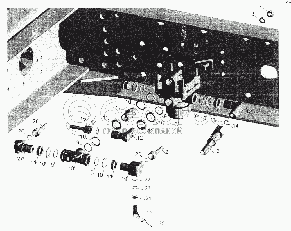 Каталог запасных частей к технике: МАЗ-544069. Установка ускорительного клапана и присоединительной арматуры