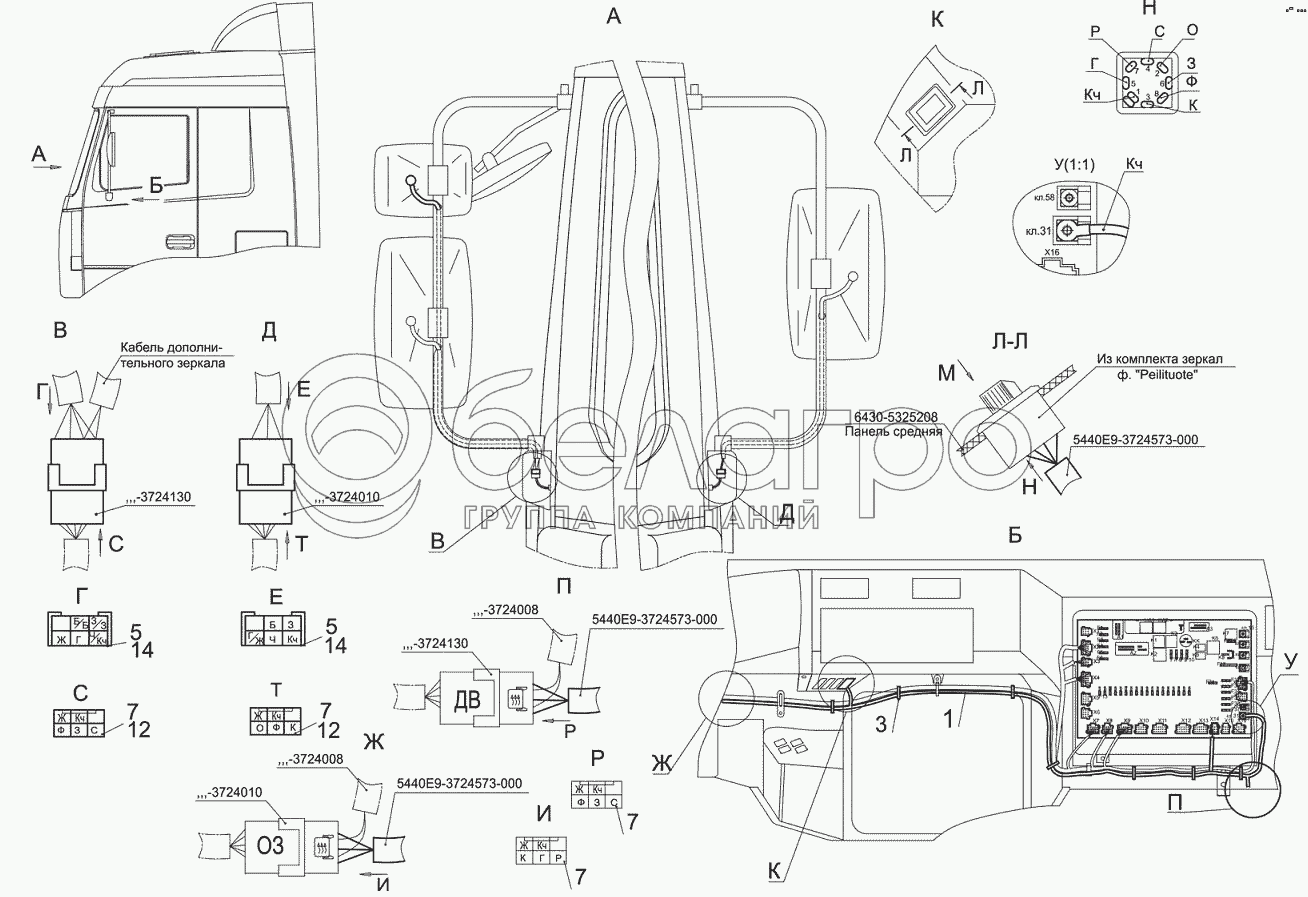 Каталог запасных частей к технике: МАЗ-5440B5. Установка кабеля обогрева зеркал 5440Е9-3700108-000