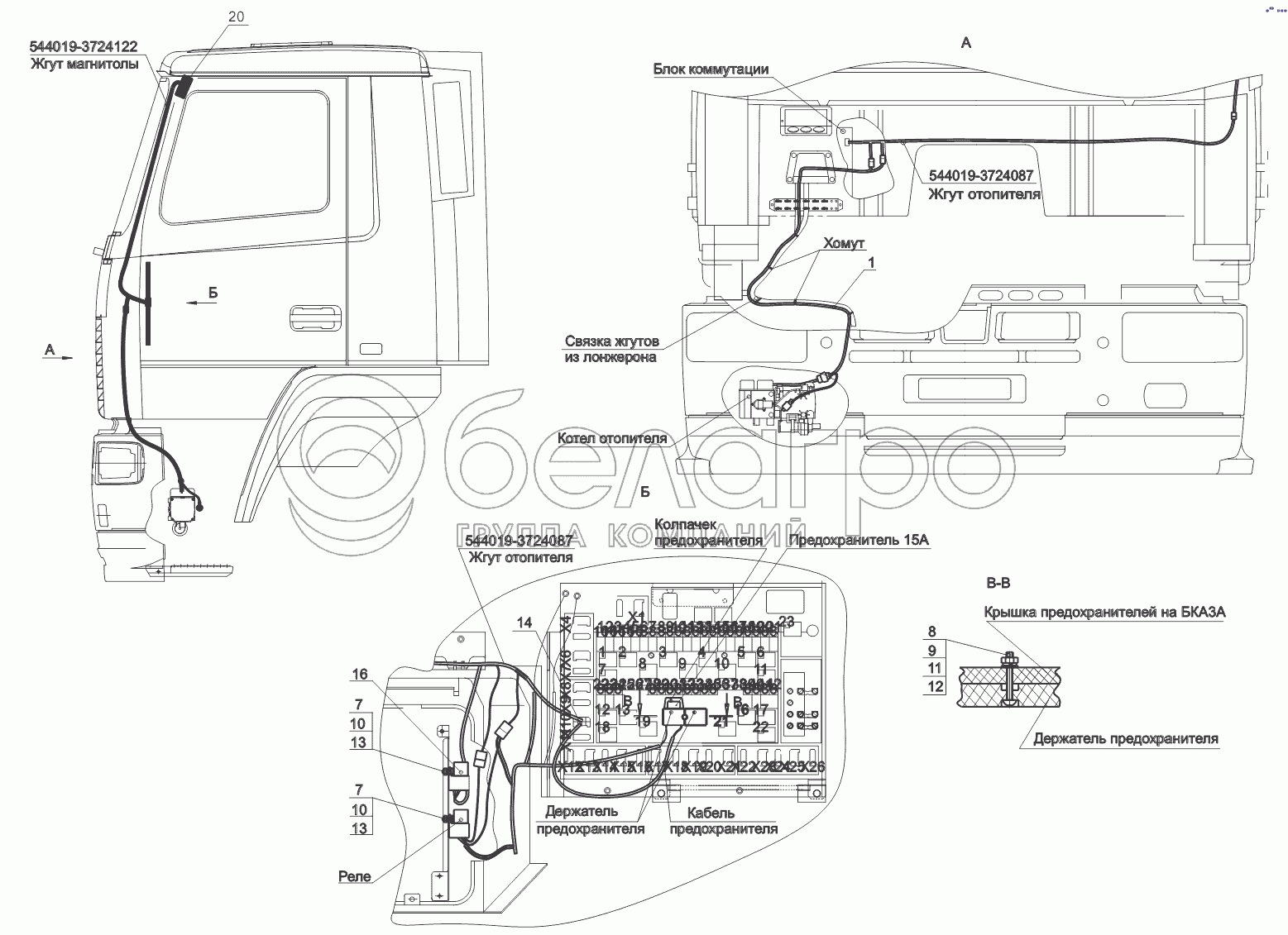 Каталог запасных частей к технике: МАЗ-5440B9, 6430B9. Установка электрооборудования подогревателя 6501-3700085
