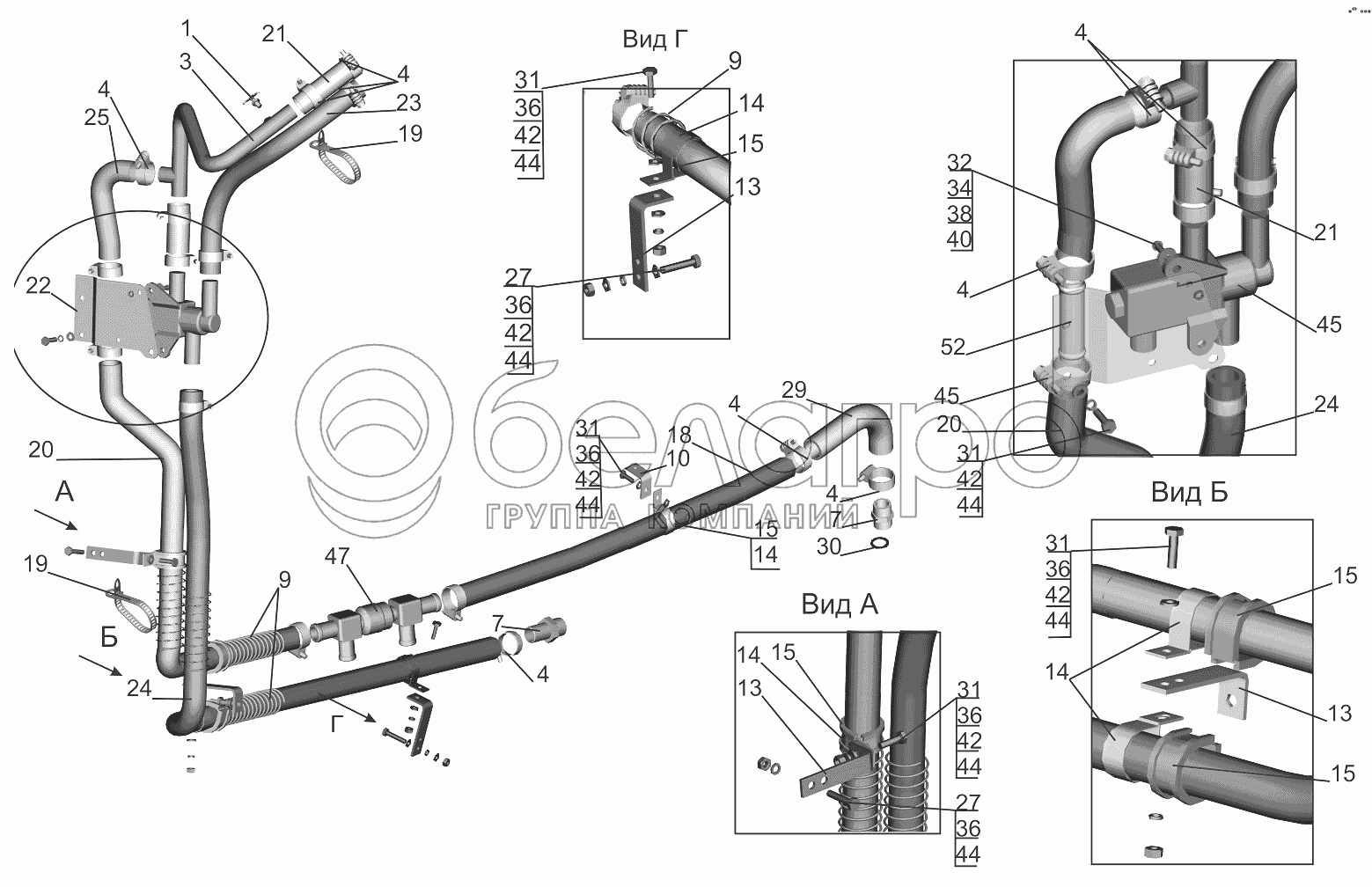 Каталог запасных частей к технике: МАЗ-5440B9, 6430B9. Установка шлангов отопителя 6516А9-8100006-030