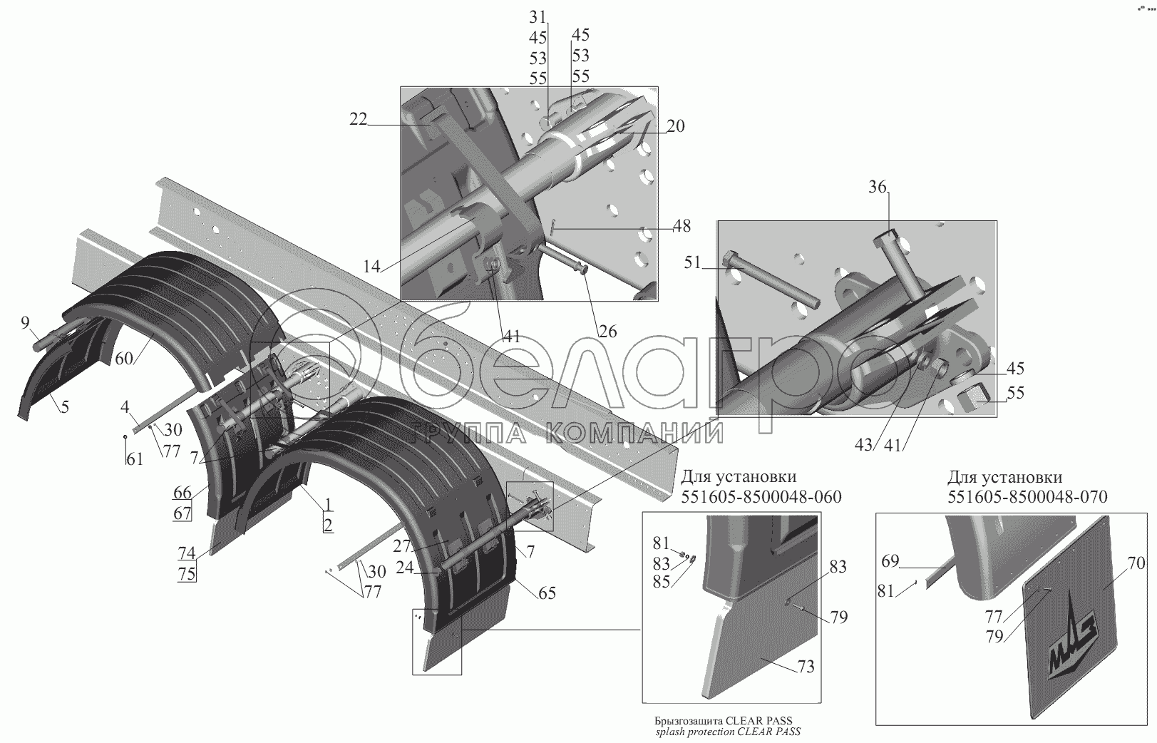 Каталог запасных частей к технике: МАЗ-551605. Установка крыльев 551605-8500048-060 (-070)