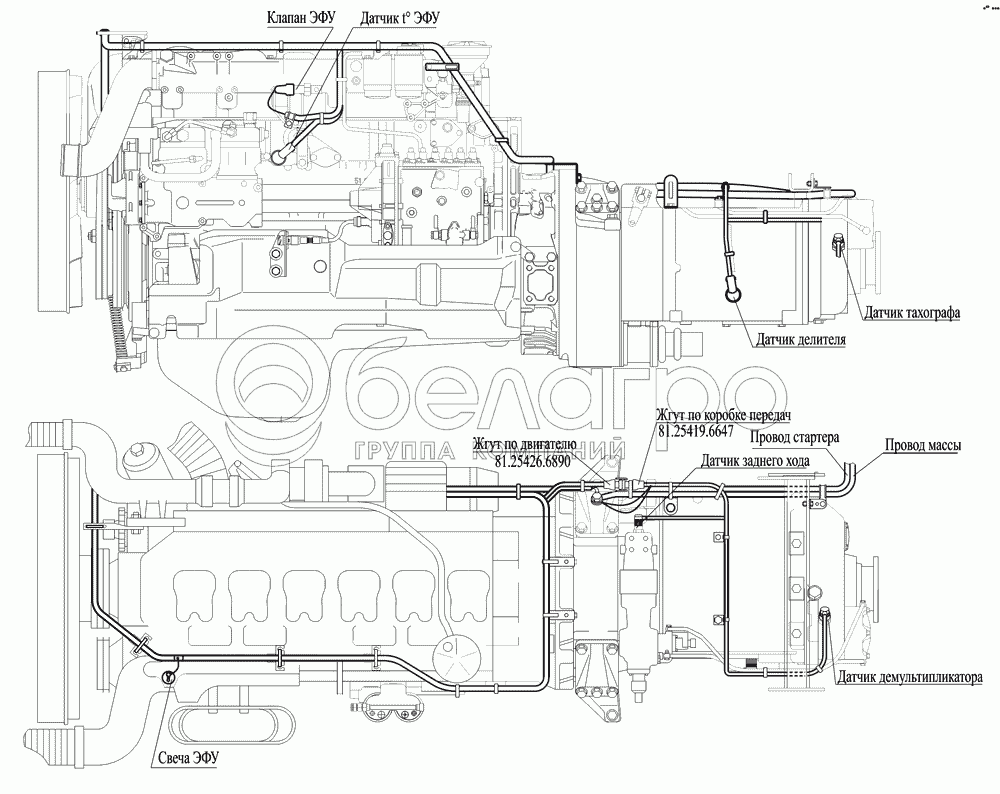 Каталог запасных частей к технике: МАЗ-551669. Монтаж жгута по двигателю