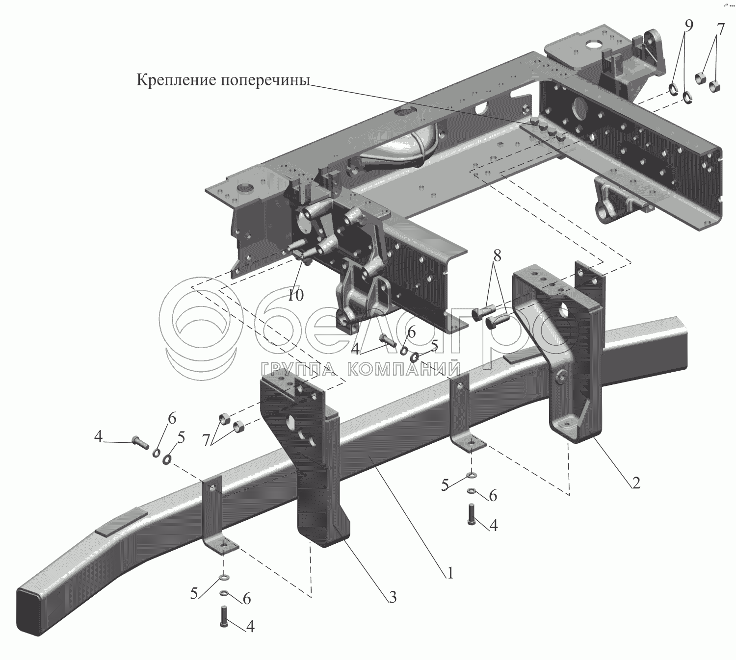 Каталог запасных частей к технике: МАЗ-551669. Установка переднего противоподкатного бруса 642208-2800030