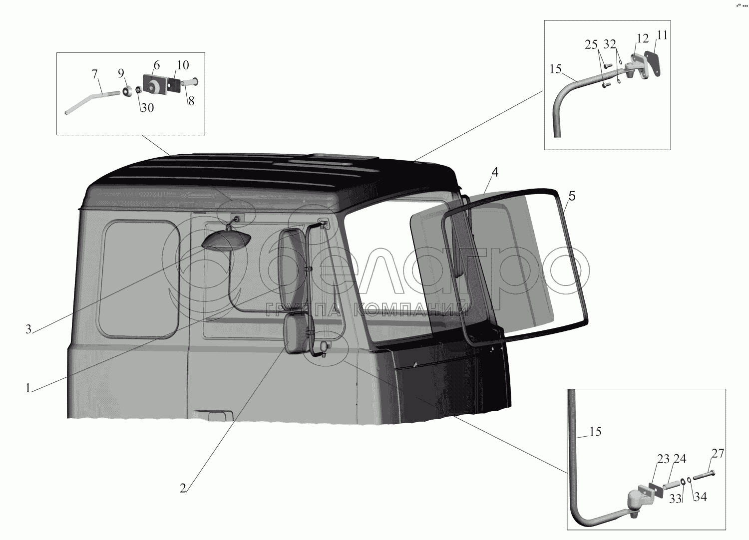 Каталог запасных частей к технике: МАЗ-551669. Установка стекол и зеркал на большую кабину