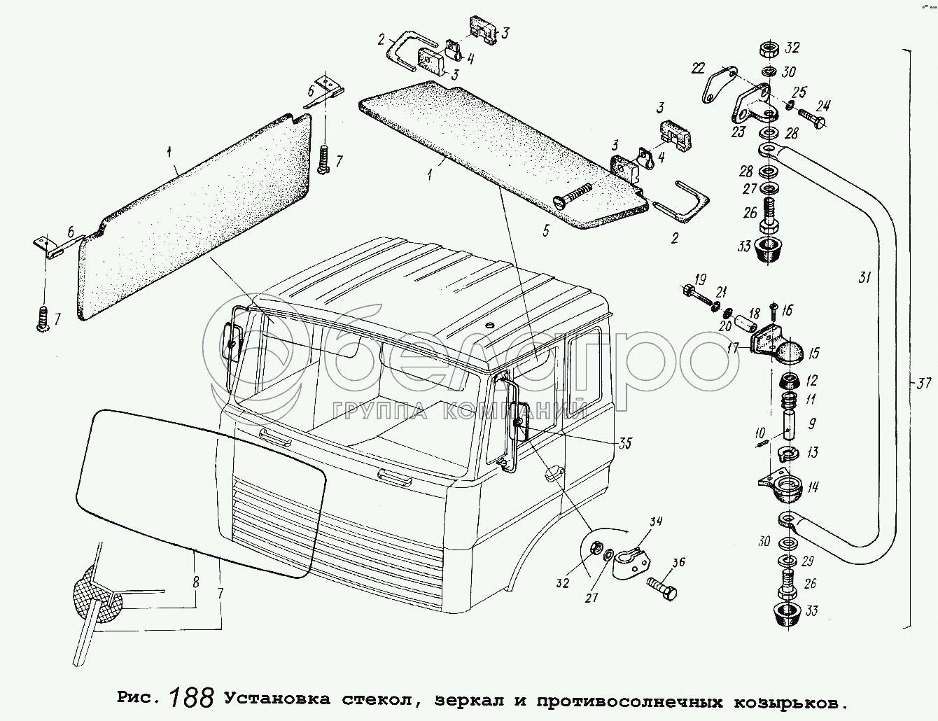 Каталог запасных частей к технике: МАЗ-5516. Установка стекол, зеркал и противосолнечных козырьков