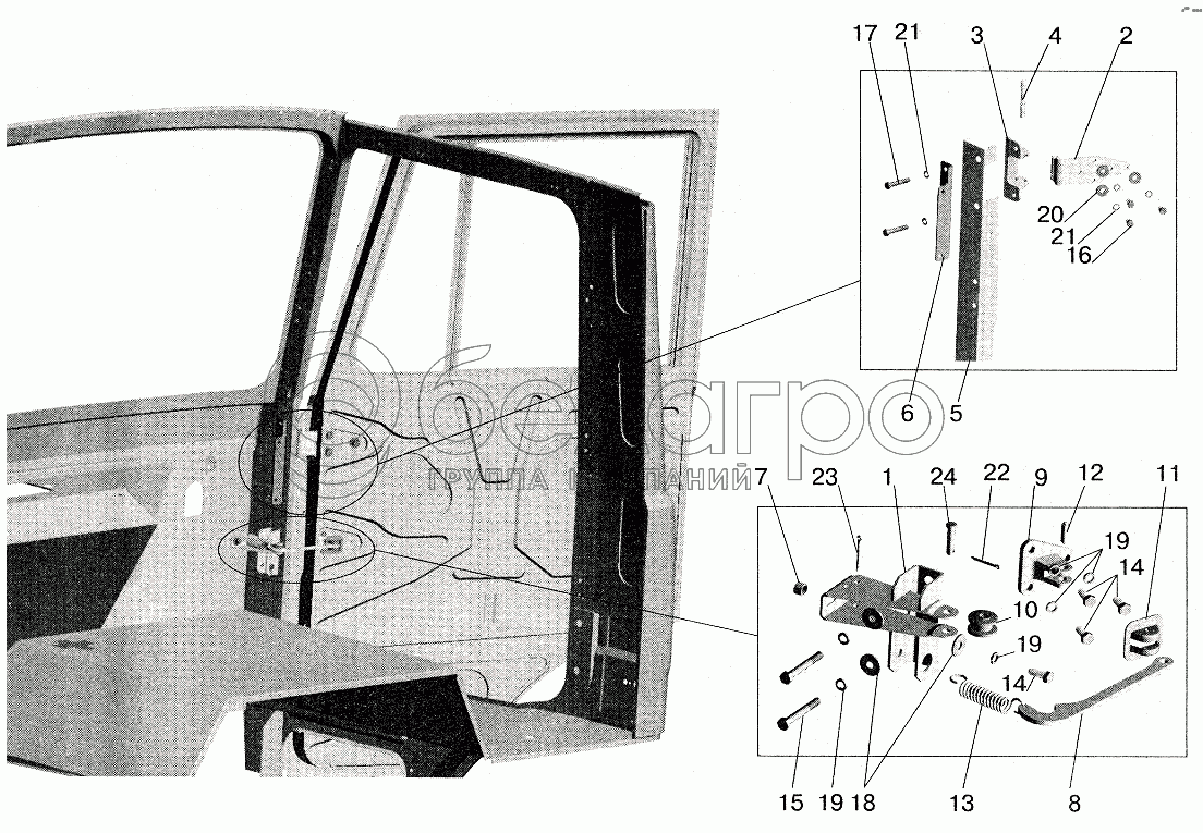 Каталог запасных частей к технике: МАЗ-5516 (2003). Установка ограничителя и петель двери