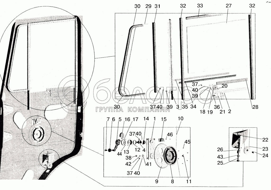 Каталог запасных частей к технике: МАЗ-5516 (2003). Установка стеклоподъемника и ручки стеклоподъемника
