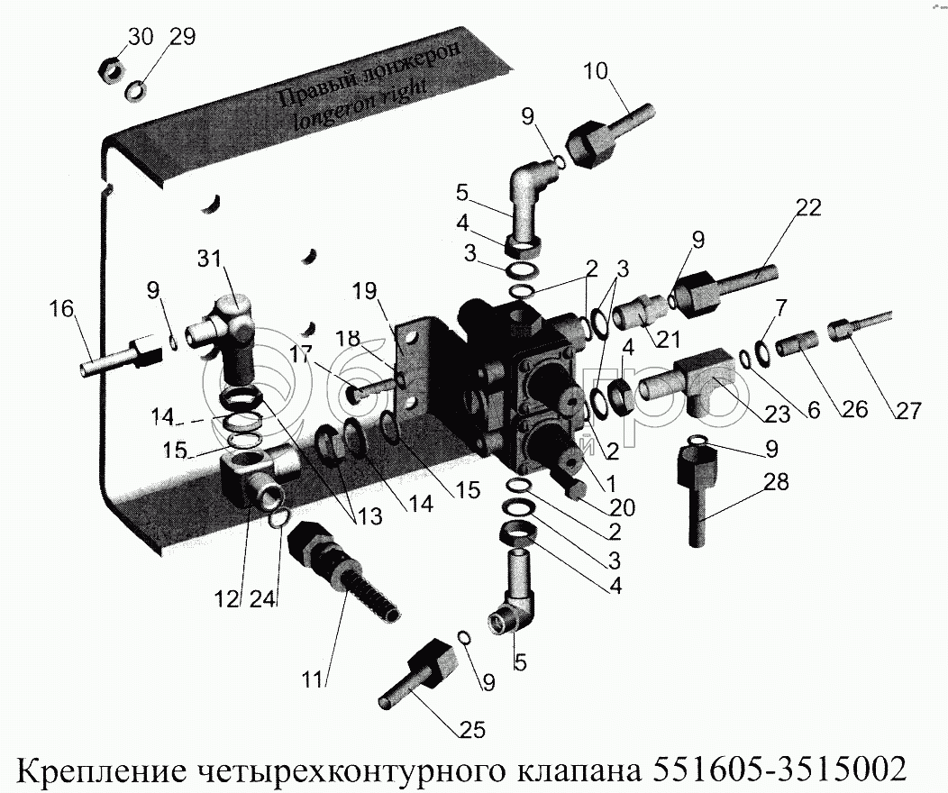 Каталог запасных частей к технике: МАЗ-5516А5. Крепление четырехконтурного клапана 551605-3515002