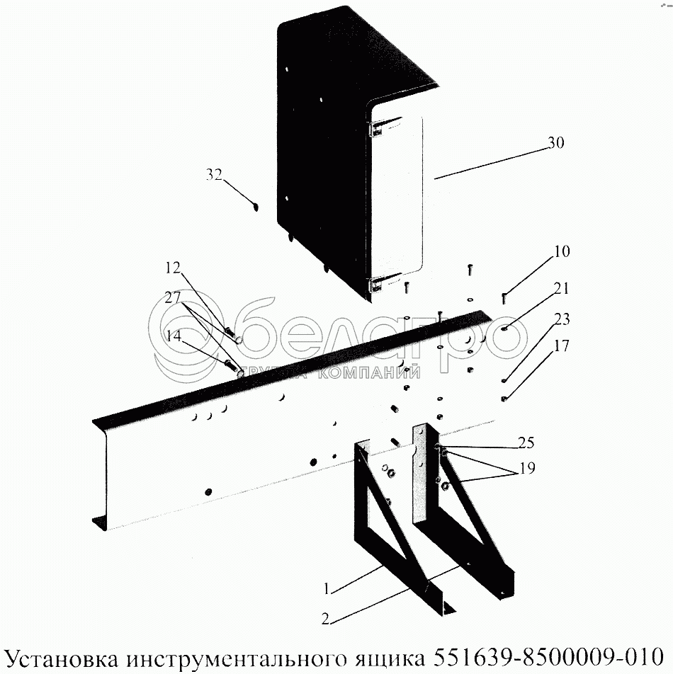 Каталог запасных частей к технике: МАЗ-5516А5. Установка инструментального ящика 551639-8500009-010