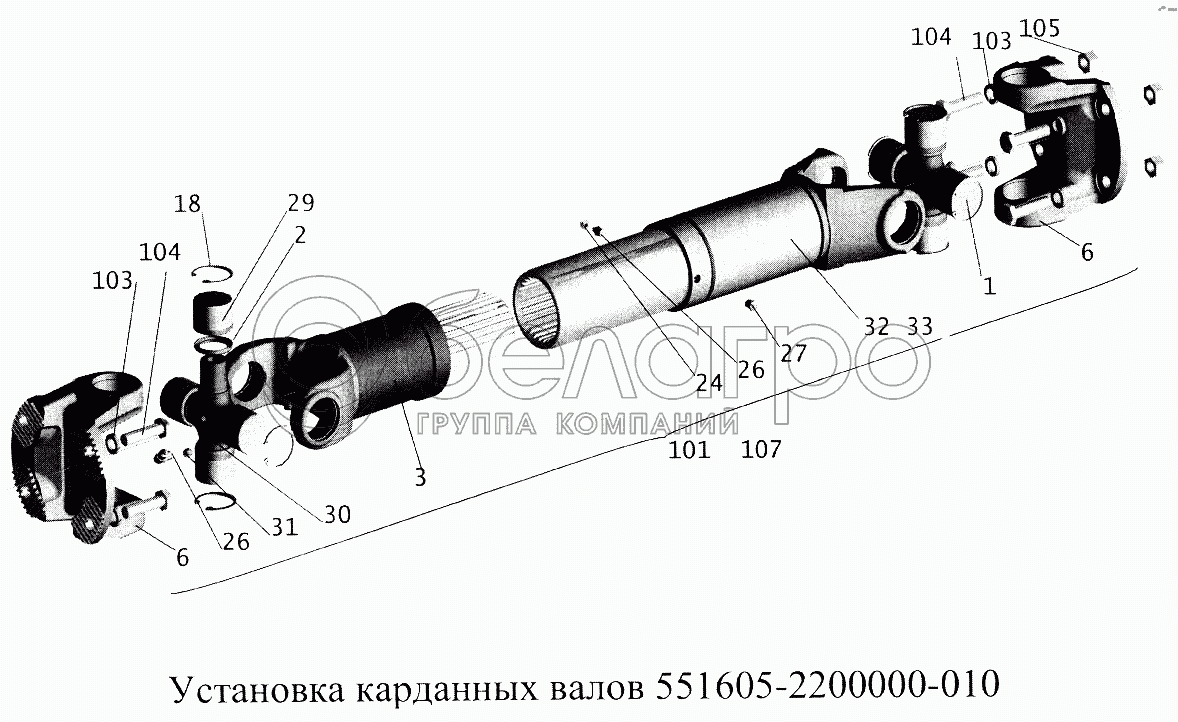 Каталог запасных частей к технике: МАЗ-5516А5. Установка карданных валов 551605-7700000-010