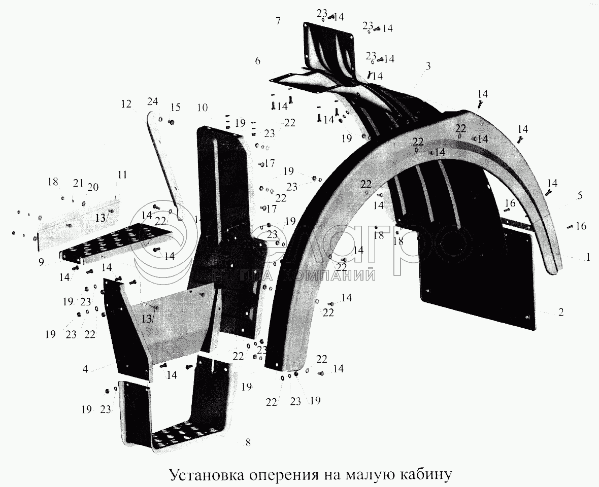 Каталог запасных частей к технике: МАЗ-5516А5. Установка оперения на малую кабину
