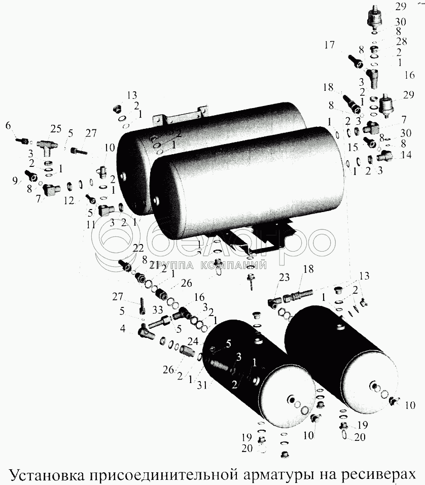 Каталог запасных частей к технике: МАЗ-5516А5. Установка присоединительной арматуры на ресиверах