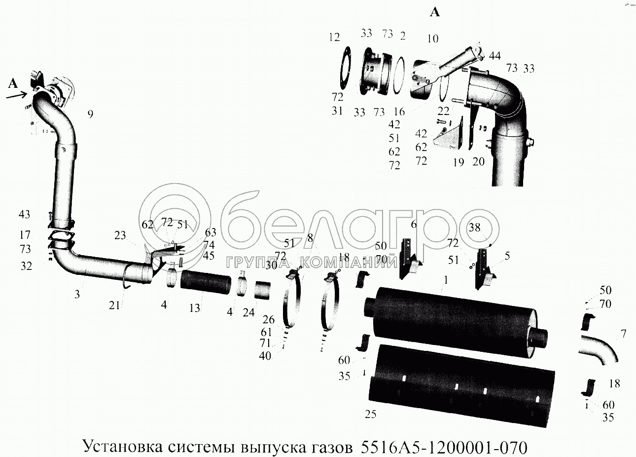 Каталог запасных частей к технике: МАЗ-5516А5. Установка системы выпуска газов 5516А5-1200001-070