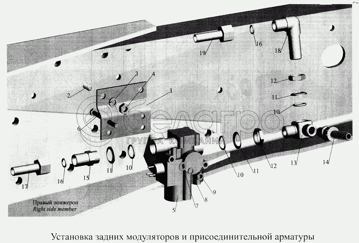 Каталог запасных частей к технике: МАЗ-5516А5. Установка задних модуляторов и присоединительной арматуры