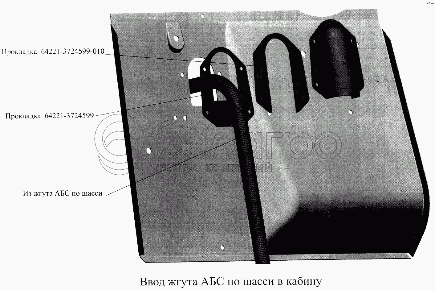 Каталог запасных частей к технике: МАЗ-5516А5. Ввод жгута АБС по шасси в кабину