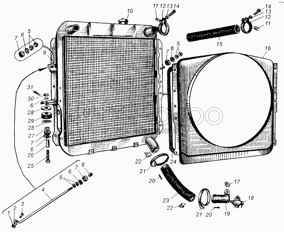 Каталог запасных частей к технике: МАЗ-5549. Радиатор и его крепление